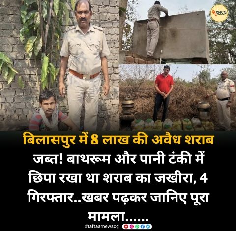 बिलासपुर में 8 लाख की अवैध शराब जब्त! बाथरूम और पानी टंकी में छिपा रखा था शराब का जखीरा, 4 गिरफ्तार..खबर पढ़कर जानिए पूरा मामला……