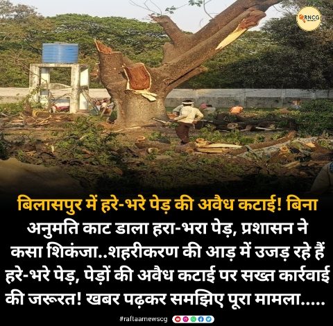 बिलासपुर में हरे-भरे पेड़ की अवैध कटाई! बिना अनुमति काट डाला हरा-भरा पेड़, प्रशासन ने कसा शिकंजा..शहरीकरण की आड़ में उजड़ रहे हैं हरे-भरे पेड़, पेड़ों की अवैध कटाई पर सख्त कार्रवाई की जरूरत! खबर पढ़कर समझिए पूरा मामला……….