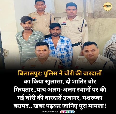 बिलासपुर; पुलिस ने चोरी की वारदातों का किया खुलासा, दो शातिर चोर गिरफ्तार..पांच अलग-अलग स्थानों पर की गई चोरी की वारदातें उजागर, मशरूका बरामद.. खबर पढ़कर जानिए पूरा मामला!