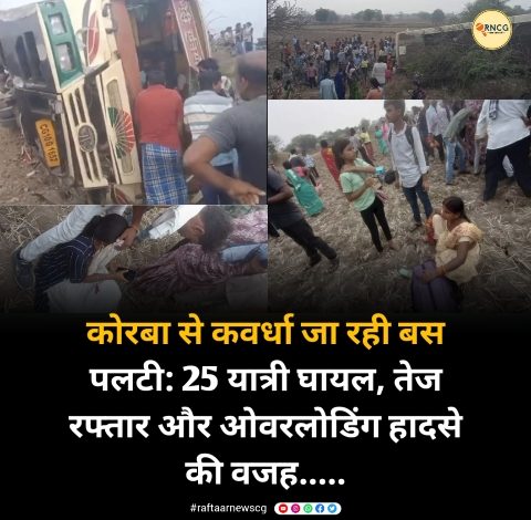 कोरबा से कवर्धा जा रही बस पलटी: 25 यात्री घायल, तेज रफ्तार और ओवरलोडिंग हादसे की वजह…..
