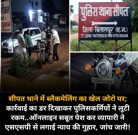 सीपत थाने में ब्लैकमेलिंग का खेल जोरो पर; कार्रवाई का डर दिखाकर पुलिसकर्मियों ने लूटी रकम..ऑनलाइन सबूत पेश कर व्यापारी ने एसएसपी से लगाई न्याय की गुहार, जांच जारी!