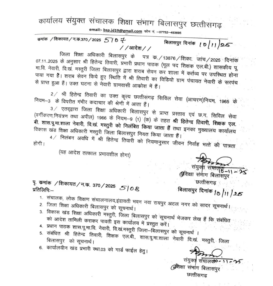 बिलासपुर: (प्रांशु क्षत्रिय) जिले के ग्राम पंचायत नेवारी स्थित शासकीय पूर्व माध्यमिक विद्यालय में नशे की हालत में पहुंचे प्रधान पाठक हितेंद्र तिवारी पर आखिरकार विभाग ने बड़ा कदम उठाया है। सोशल मीडिया पर वीडियो वायरल होने के बाद संयुक्त संचालक शिक्षा विभाग ने शिक्षक को तत्काल प्रभाव से निलंबित कर दिया है।