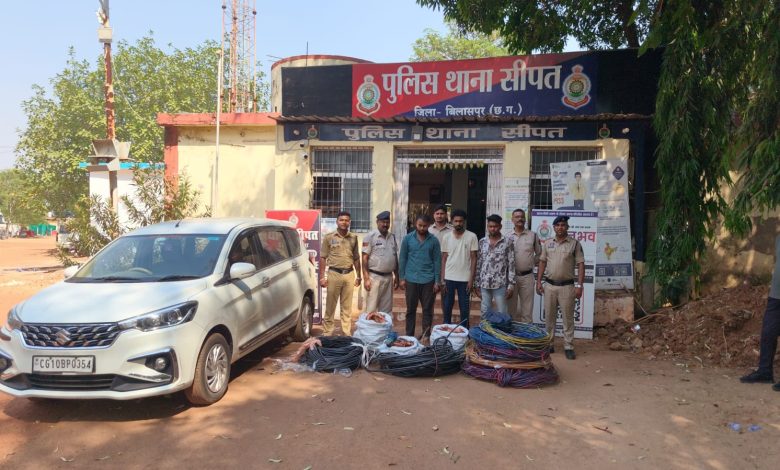 सीपत: (प्रांशु क्षत्रिय) सीपत थाना पुलिस ने मोबाइल टॉवर से केबल तार चोरी करने वाले एक सक्रिय गिरोह का पर्दाफाश करते हुए तीन आरोपियों और तीन विधि से संघर्षरत बालकों को गिरफ्तार किया है। पुलिस ने आरोपियों के कब्जे से करीब 2.90 लाख रुपये मूल्य के केबल तार, चोरी में इस्तेमाल होने वाले औजार और एक आर्टिका कार जब्त की है। पुलिस के अनुसार, मुखबिर से सूचना मिली थी कि ग्राम खम्हरिया के सोंठी रोड बाजार के पास कुछ युवक संदिग्ध गतिविधियों में लिप्त हैं। सूचना पर थाना प्रभारी के निर्देशन में टीम गठित कर घेराबंदी की गई और मुख्य आरोपी शहबाज अली सहित अन्य साथियों को हिरासत में लिया गया। पूछताछ में आरोपियों ने बताया कि वे पिछले चार-पांच महीनों से अलग-अलग क्षेत्रों में मोबाइल टॉवर से कॉपर केबल और एल्युमिनियम तार चोरी कर रहे थे। गिरोह तखतपुर, काठाकोनी, चोरभट्ठी, गनियारी, जयराम नगर, मुंगेली, कुंडा (कबीरधाम), अकलतरा और कोरबा सहित कई स्थानों पर वारदात कर चुका है। पुलिस ने आरोपियों की निशानदेही पर एक क्विंटल दो किलो छीला हुआ कॉपर केबल (कीमत 1,22,400 रुपये), 54 किलो प्लास्टिक कोटेड कॉपर केबल (कीमत 1,08,000 रुपये) और 12 बंडल एल्युमिनियम तार (कीमत 60,000 रुपये) बरामद किया। साथ ही वारदात में प्रयुक्त सफेद रंग की आर्टिका कार भी जब्त की गई। गिरफ्तार आरोपियों में शहबाज अली (25), जगदीश कुमार पटेल (24) और मोईउद्दीन (27) शामिल हैं, जबकि तीन विधि से संघर्षरत बालकों को किशोर न्याय बोर्ड बिलासपुर भेजा गया है। पुलिस ने आरोपियों को न्यायिक रिमांड पर जेल भेज दिया है।