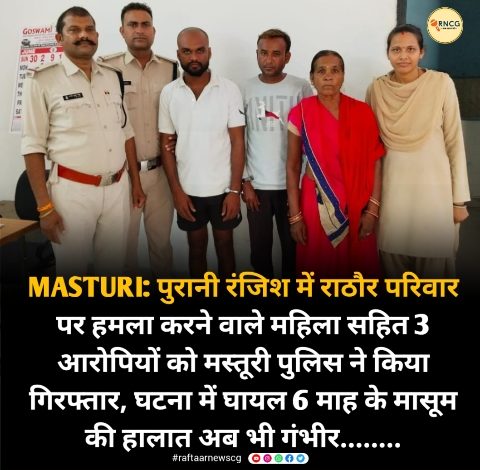 MASTURI: पुरानी रंजिश में राठौर परिवार पर हमला करने वाले महिला सहित 3 आरोपियों को मस्तूरी पुलिस ने किया गिरफ्तार, घटना में घायल 6 माह के मासूम की हालात अब भी गंभीर……..