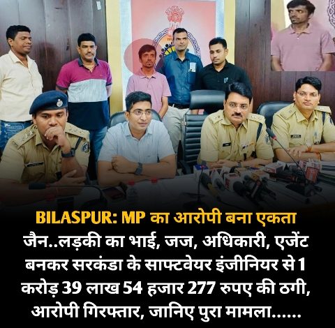 BILASPUR: MP का आरोपी बना एकता जैन..लड़की का भाई, जज, अधिकारी, एजेंट बनकर सरकंडा के साफ्टवेयर इंजीनियर से 1 करोड़ 39 लाख 54 हजार 277 रुपए की ठगी, आरोपी गिरफ्तार, जानिए मामला……
