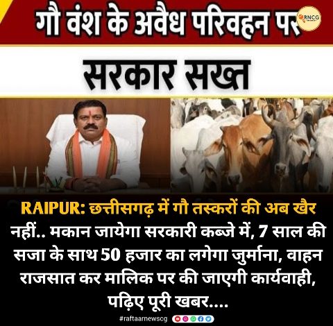 RAIPUR: छत्तीसगढ़ में गौ तस्करों की अब खैर नहीं.. मकान जायेगा सरकारी कब्जे में, 7 साल की सजा के साथ 50 हजार का लगेगा जुर्माना, वाहन राजसात कर मालिक पर की जाएगी कार्यवाही, पढ़िए पूरी खबर….