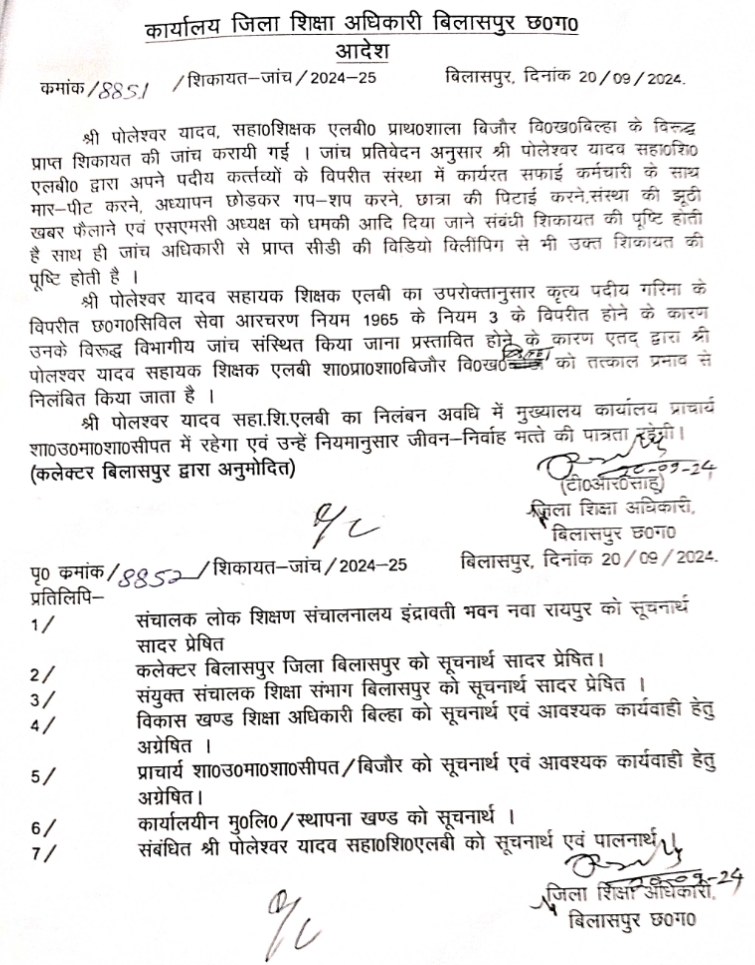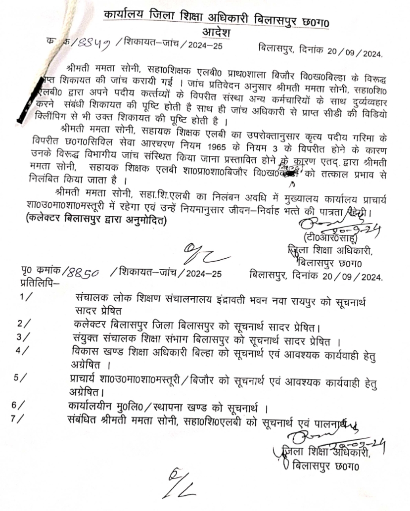 बिलासपुर (प्रांशु क्षत्रिय) बिलासपुर जिले में शिक्षा विभाग ने दो शिक्षकों को अपने सहकर्मियों के साथ दुर्व्यवहार के आरोप में निलंबित कर दिया है। सहायक शिक्षक ममता सोनी एलबी प्राथमिक शाला बिजौर के खिलाफ जप्त शिकायत की जांच में उनके द्वारा अन्य कर्मचारियों के साथ दुर्व्यवहार की पुष्टि हुई। जांच में प्राप्त वीडियो क्लिपिंग ने भी इस आरोप को सही ठहराया।