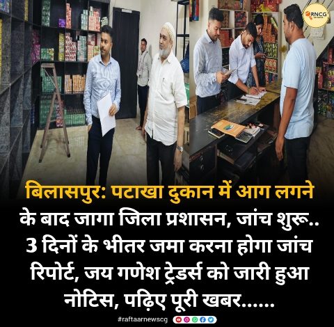 बिलासपुर: पटाखा दुकान में आग लगने के बाद जागा जिला प्रशासन, जांच शुरू.. 3 दिनों के भीतर जमा करना होगा जांच रिपोर्ट, जय गणेश ट्रेडर्स को जारी हुआ नोटिस, पढ़िए पूरी खबर……
