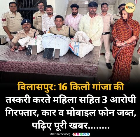 बिलासपुर: 16 किलो गांजा की तस्करी करते महिला सहित 3 आरोपी गिरफ्तार, कार व मोबाइल फोन जब्त, पढ़िए पूरी खबर……..