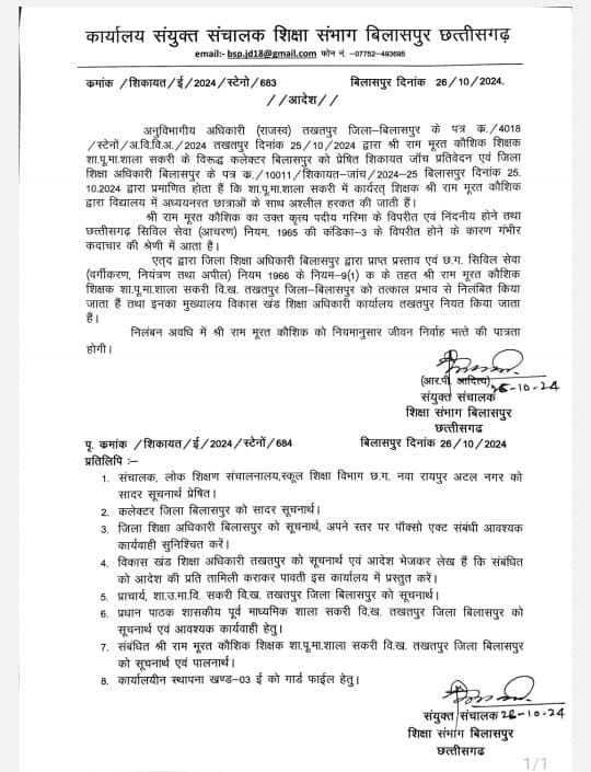 बिलासपुर: (प्रांशु क्षत्रिय) छात्राओं से अश्लील हरकत के आरोप में शिक्षक राम मूरत कौशिक को निलंबित कर दिया गया है। संयुक्त संचालक शिक्षा बिलासपुर ने शनिवार को निलंबन आदेश जारी किया है। मामला तखतपुर विकासखंड के सकरी पूर्व माध्यमिक स्कूल का है। छात्राओं ने शिक्षक के विरुद्ध अश्लील हरकत किए जाने की शिकायत कलेक्टर बिलासपुर से की। कलेक्टर ने मामले की गंभीरता को देखते हुए तत्काल एसडीएम तखतपुर और जिला शिक्षा अधिकारी से जांच करवाई। दोनों अधिकारियों ने तत्परता से शिकायत की जांच कर घटना को सही पाया। इससे प्रमाणित हुआ कि शा.पू.मा.शाला सकरी में कार्यरत शिक्षक राम मूरत कौशिक द्वारा विद्यालय में अध्ययनरत छात्राओं के साथ अश्लील हरकत किया जाता रहा है। राम मूरत कौशिक का उक्त कृत्य पदीय गरिमा के विपरीत एवं निंदनीय होने तथा छत्तीसगढ़ सिविल सेवा (आचरण) नियम 1965 की कंडिका-3 के विपरीत होने के कारण गंभीर कदाचार की श्रेणी में आता है। इसलिए जिला शिक्षा अधिकारी बिलासपुर द्वारा प्राप्त प्रस्ताव एवं छ.ग. सिविल सेवा (वर्गीकरण, नियंत्रण तथा अपील) नियम 1966 के नियम-9 (1) क के तहत श्री राम मूरत कौशिक शिक्षक शा.पू.मा.शाला सकरी वि.ख. तखतपुर जिला-बिलासपुर को तत्काल प्रभाव से निलंबित किया गया तथा इनका मुख्यालय विकास खंड शिक्षा अधिकारी कार्यालय तखतपुर नियत किया गया। निलंबन अवधि में राम मूरत कौशिक को नियमानुसार जीवन निर्वाह भत्ते की पात्रता होगी।