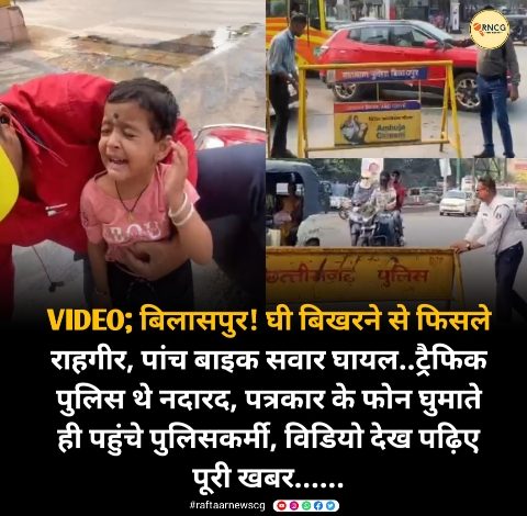 VIDEO; बिलासपुर! घी बिखरने से फिसले राहगीर, पांच बाइक सवार घायल..ट्रैफिक पुलिस थे नदारद, पत्रकार के फोन घुमाते ही पहुंचे पुलिसकर्मी, विडियो देख पढ़िए पूरी खबर……