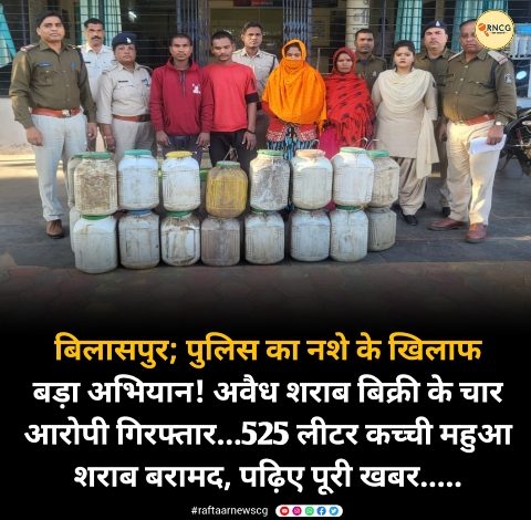 बिलासपुर; पुलिस का नशे के खिलाफ बड़ा अभियान! अवैध शराब बिक्री के चार आरोपी गिरफ्तार…525 लीटर कच्ची महुआ शराब बरामद, पढ़िए पूरी खबर…..