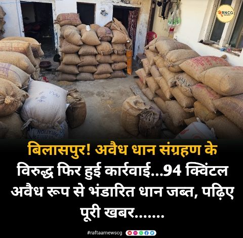 बिलासपुर! अवैध धान संग्रहण के विरुद्ध फिर हुई कार्रवाई…94 क्विंटल अवैध रूप से भंडारित धान जब्त, पढ़िए पूरी खबर…….