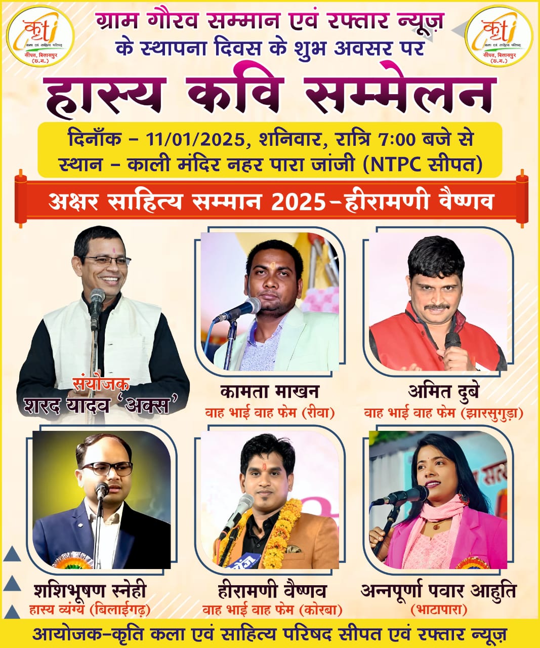 कार्यक्रम में देशभर से आए ख्याति प्राप्त कवि अपनी हास्य रचनाओं से समा बांधेंगे। मध्य प्रदेश के रीवा से कवि कामता माखन, झारसुंगडा से कवि अमित दुबे, बिलाईगढ़ से कवि शशिभूषण सोनी, कोरबा से कवि हीरामणि और भाटापारा से कवयित्री अन्नपूर्णा पवार अपनी कविताओं से श्रोताओं का मनोरंजन करेंगे। इस कार्यक्रम का संयोजन कवि शरद यादव द्वारा किया जा रहा है।