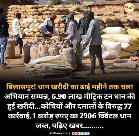 बिलासपुर! धान खरीदी का ढाई महीने तक चला अभियान सम्पन्न, 6.90 लाख मीट्रिक टन धान की हुई खरीदी…कोचियों और दलालों के विरुद्ध 77 कार्रवाई, 1 करोड़ रुपए का 2906 क्विंटल धान जब्त, पढ़िए खबर……….