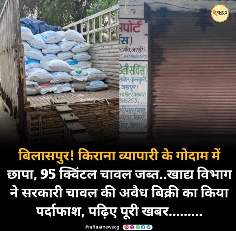 बिलासपुर! किराना व्यापारी के गोदाम में छापा, 95 क्विंटल चावल जब्त..खाद्य विभाग ने सरकारी चावल की अवैध बिक्री का किया पर्दाफाश, पढ़िए पूरी खबर………